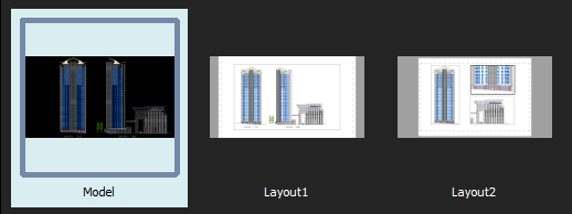 I riquadri di anteprima vengono visualizzati sotto la scheda contenente il modello e tutti i fogli di layout con l'area di lavoro attiva evidenziata.